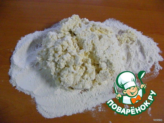 Гововим тесто: в творог вбить яйца, всыпать соду, соль по вкусу и муку.