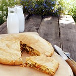 Раскатать второй пласт теста. Накрыть сверху начинку и защипать. Смазать поверхность пирога молоком (или яичным желтком).