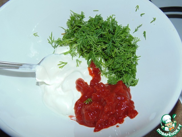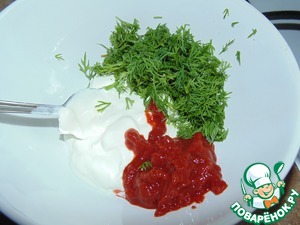 Смешать сметану, томатную пасту и зелень, добавить примерно 100 мл. воды.
