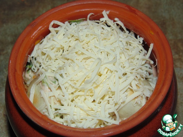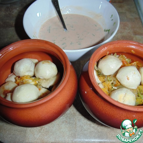 Рецепт «Пельмени в горшочках с овощным соусом»: