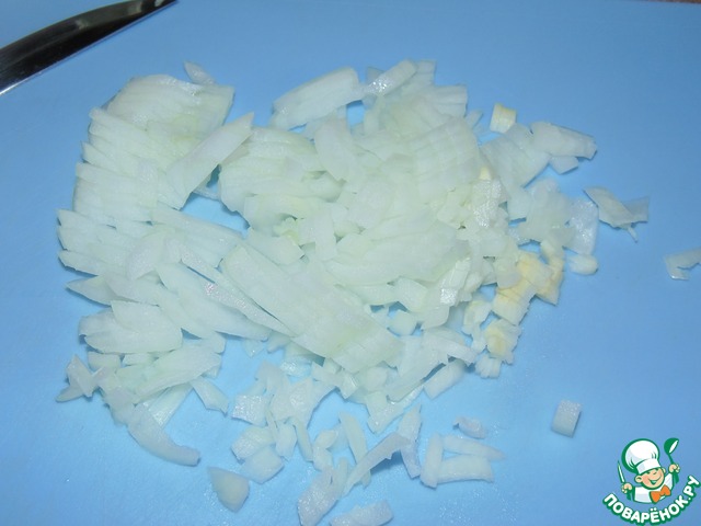 • Лук мелко порезать. Обжарить на растительном масле до прозрачности.