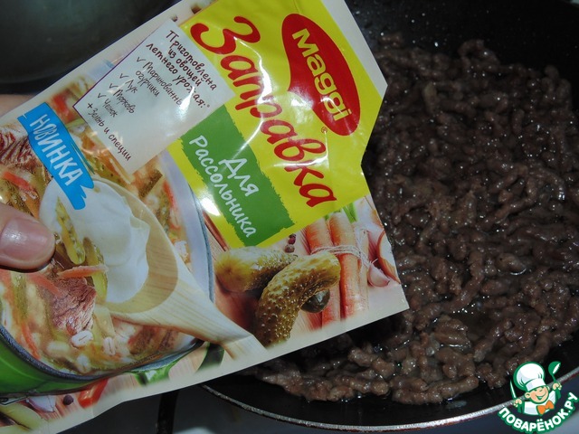 • Когда фарш будет готов, добавить Магги заправку для рассольника. Перемешать.