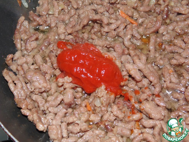 • В сковороду добавить мясной фарш. Спагетти сварить согласно инструкции на упаковке.