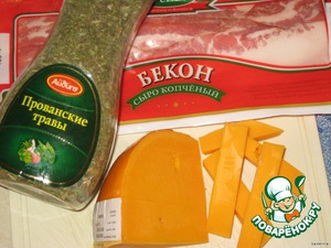 Вот что нужно для начинки: бекон, травы, сыр, порезанный на ломтики.
