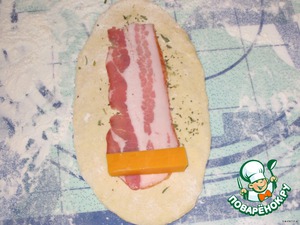 Затем положить кусочек бекона, на край лепешки положить кусочек сыра.