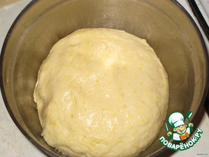 Тесто должно увеличиться в два раза, затем обмять и дать еще раз подняться в два раза.