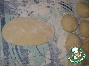 Каждый шарик раскатать в продолговатую лепешку, мне скалка не понадобилась, тесто мягкое и я расплющивала руками.
