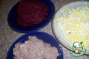 Дно блюда смазать немного смесью из майонеза, потом половину свеклы, лука, немного смазать смесью из майонеза.