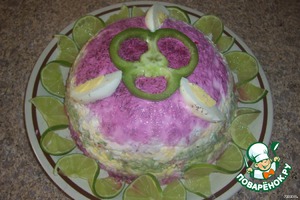 -остальной лук и свекла, сверху смазать оставшимся майонезом с йогуртом.