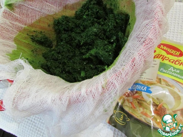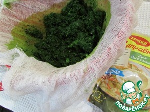 Выложить зеленую массу на марлю, сложенную в два слоя. Затем марлю свернуть в узелок и отжать сок.