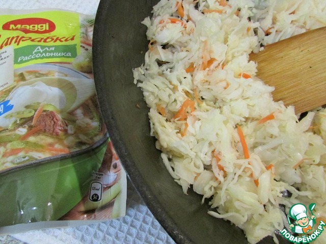 Затем соединить жареный лук и капусту, добавить MAGGI® Заправка для Рассольника. Все хорошо перемешать.