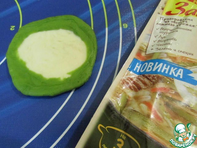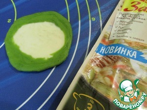 Затем раскатать две колбаски из двух видов теста - белую и зеленую. Тесто очень мягкое и эластичное, не требует дополнительного подпыливания мукой рабочей поверхности. Зеленую колбаску раскатать шириной примерно 8-9 см.