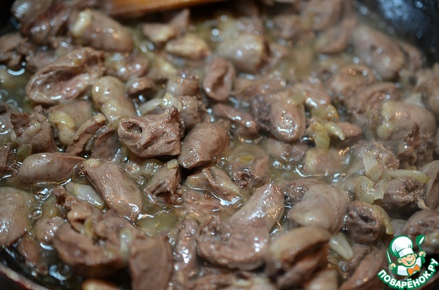 Добавить сердечки и обжарить всё на сильном огне около 7 минут.