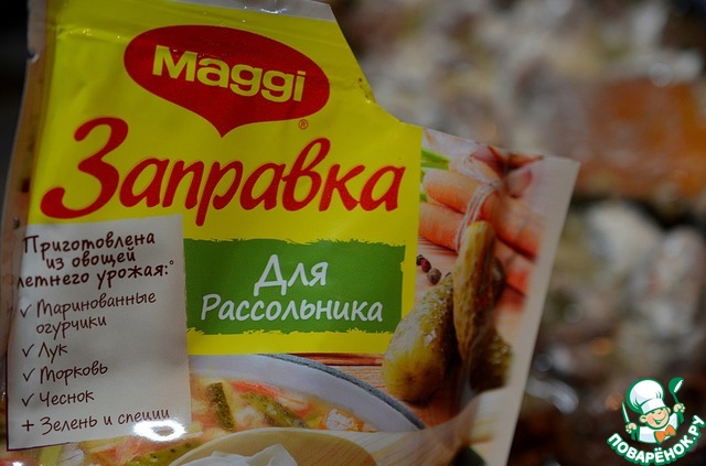 Заправку MAGGI® "Заправка для Рассольника". Она содержит натуральные овощи и настоящие маринованные огурчики.