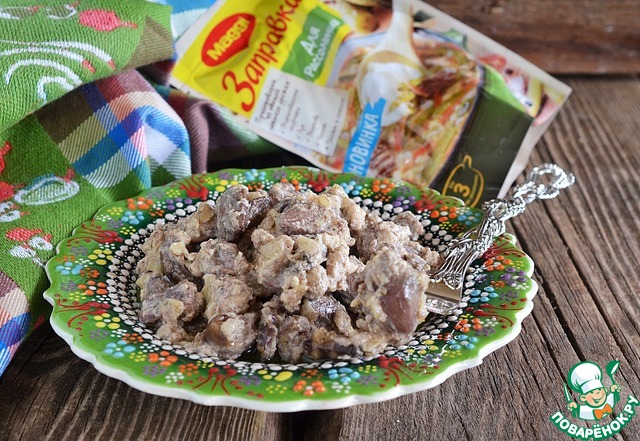Куриные сердечки я просто обожаю и готовлю их по разным рецептам. В этом рецепте сметанный соус прекрасно сочетается с сыром, овощами и маринованными огурчиками,- всё это благодаря заправке для Рассольника Mаggi! Очень быстро, просто и вкусно!
