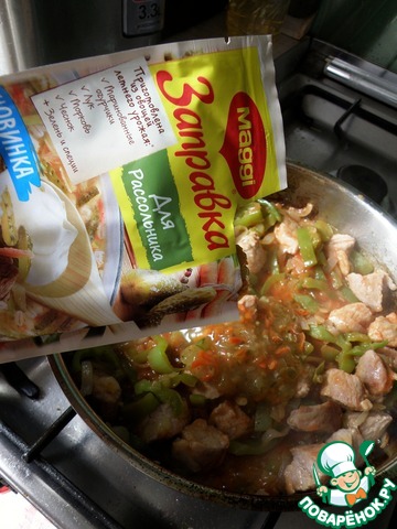 Добавить заправку для рассольника от Магги и полстакана кипятка. Накрыть крышкой и тушить на слабом огне 15 минут.