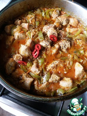 Мясо нарезать средними кубиками. Лук и перец нарезать средней соломкой.