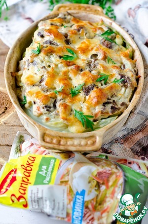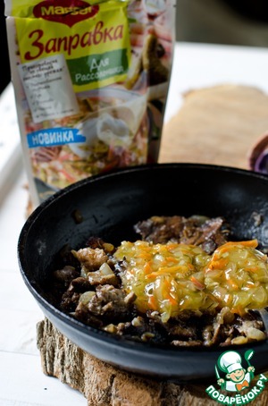 Теперь переходим к изюминке нашей запеканки, а именно к заправке Магги для рассольника с маринованными огурчиками, добавит ее к грибам и тушить еще пару минут.