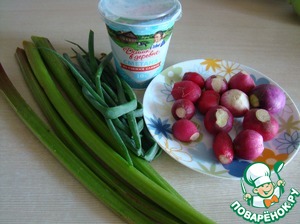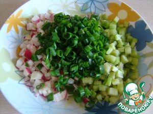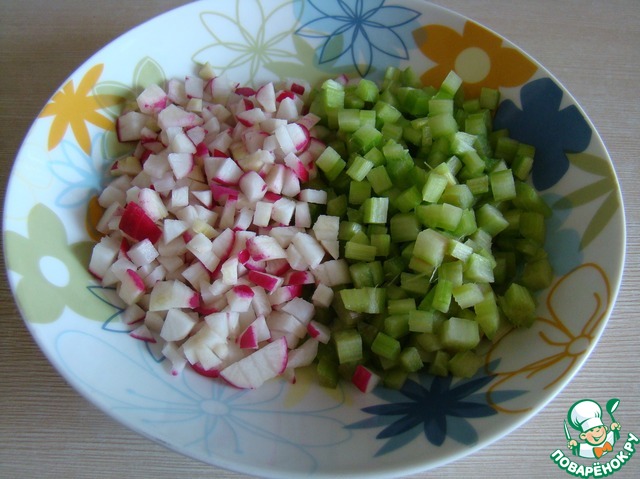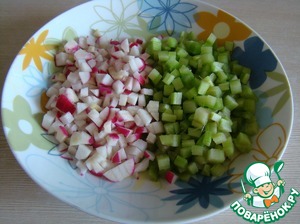 С черешков ревеня снять кожицу, нарезать мелкими кубиками (горошком). Также нарезать редис.