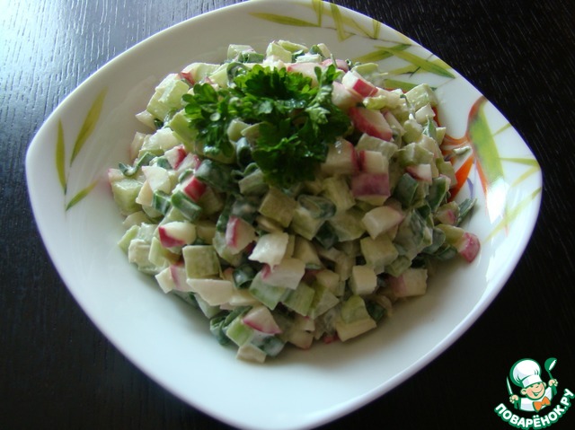 Рецепт из книги Карима Махмудова "Пловы на любой вкус". Этот освежающий салат автор советует подавать к плову для смягчения его жирности. Кислинка ревеня интересно сочетается в салате с легкой горчинкой редиса.
