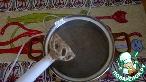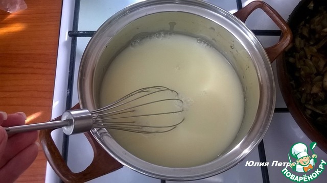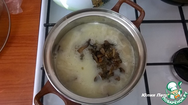 Затем постепенно, не прекращая помешивать, влить бульон и довести его до кипения.