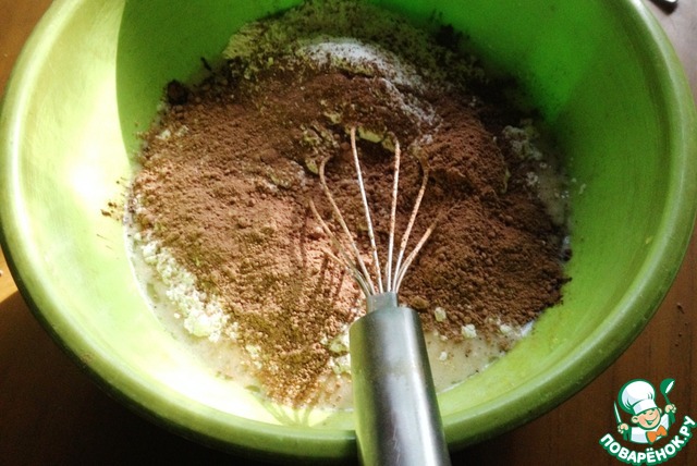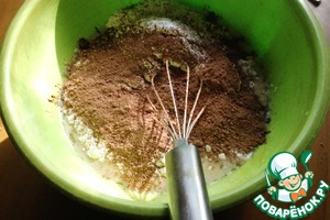Ввести муку, смешанную с разрыхлителем муки, какао, корицей и цедрой апельсина. Перемешать.