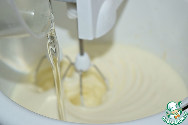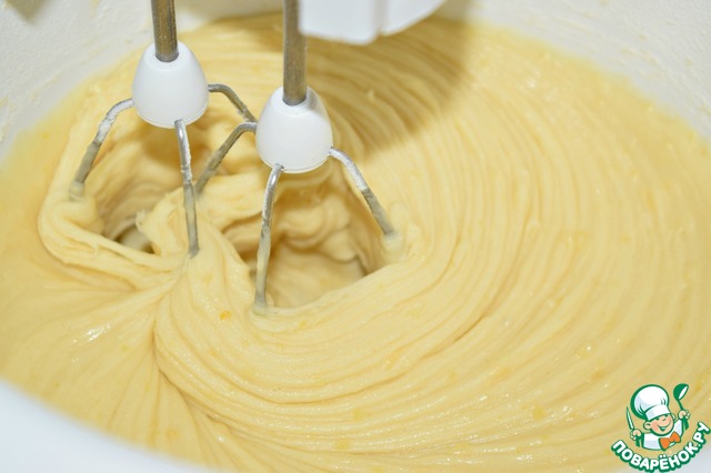 Уменьшить обороты миксера и влить растопленное (но уже остывшее!) сливочное масло. Добавить лимонную цедру.