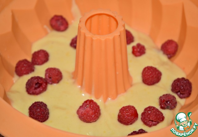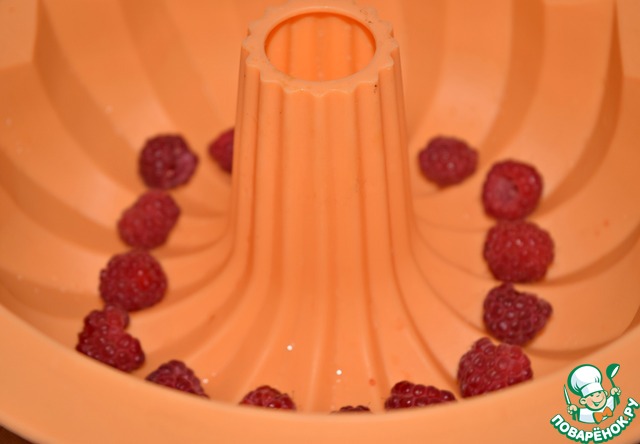 Можно, конечно, ягоды малины сразу вмешать в тесто. Но я поступаю по-другому: на дно формы (у меня силиконовая форма для кексов объемом 2 л, верхний диаметр 22 см, нижний-15 см) выкладываю несколько ягод...