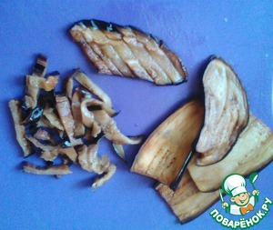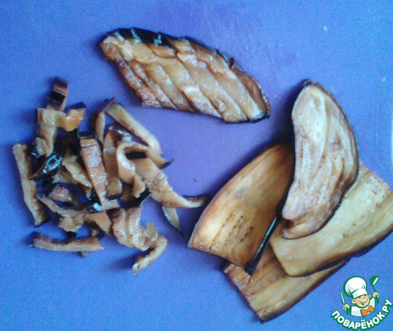 Перед тем как обжарить баклажан, нарезать его ломтиками (разрезаю пополам, ставлю половинку на срез и нарезаю тонкими ломтиками 5-7 мм), посыпать солью и дать пустить сок.