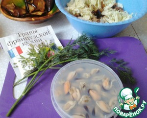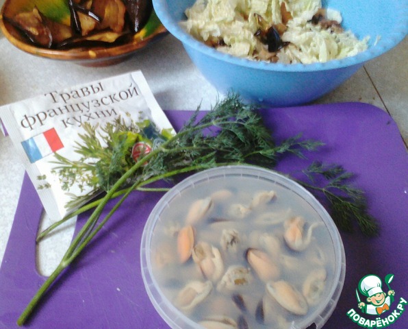 В чашу с капустой и баклажанами добавить мидии (рассол слить), порубленные пару веточек укропа, специи (у меня травы французской кухни).
