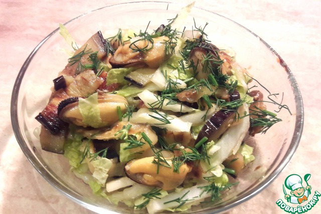 Очень вкусный салат с мидиями, жареными баклажанами и китайской капустой. Очень легко готовить. Любители морепродуктов оценят этот нежный салат по достоинству!