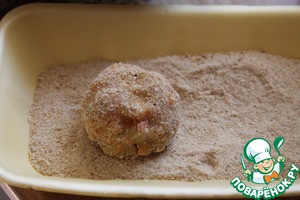 Мокрыми руками формовать небольшие шарики и обваливать их в панировочных сухарях.