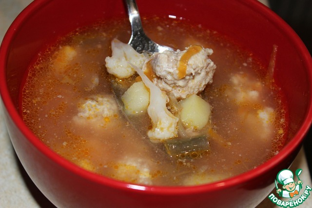 Тем временем, добавить к картофелю разобранную на соцветия цветную капусту и фрикадельки. Продолжаем варить 10 минут.
