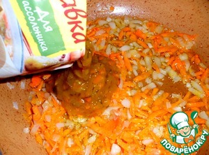 Добавить в сковороду к луку с морковкой, заправку для рассольника Магги.