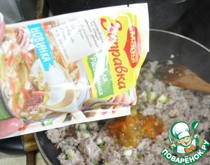 Добавляем заправку в обжаренный фарш, перемешиваем. Не солим, приправ также достаточно в заправке.