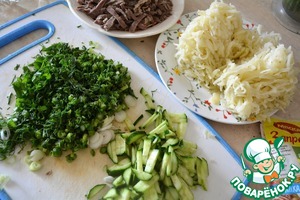 Так же соломкой режем огурец, измельчаем зелень, натираем на крупной терке картофель
