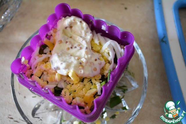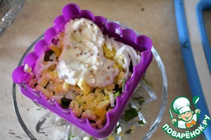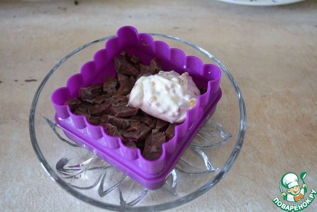 Берем формочку для салата (В конце рецепта я написала, как выкручиваюсь из этой ситуации). Если такой нет - можно просто сделать все в салатнике - просто слои не будут просматриваться.