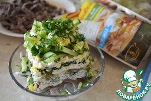Сверху слой свежих огурчиков, крошим желток и посыпаем оставшейся зеленью