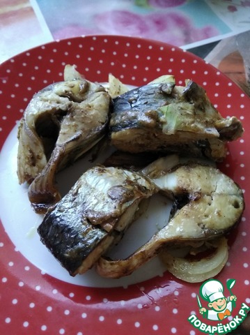 Скумбрию разморозить, отрезать голову и выпотрошить. Порезать на порционные кусочки, сложить в глубокую тарелку.