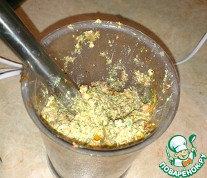 Добавила масло оливковое и льняное, соевый соус, смесь перцев. Блендер порубил всё в мягкую массу,