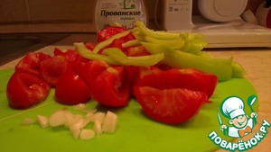 В готовом паштете была смесь сушеных томатов и болгарского перца. Я использовала свежие овощи, поэтому их запекла в мультиварке, в режиме духовка. Для этого помидоры помыла, нарезала на дольки и очистила от семян и сока (использовала их потом в суп:)). Перец тоже порезала на дольки.