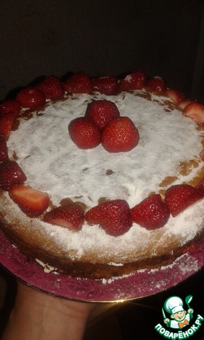 • 7. Верхний корж украсить сахарной пудрой и ягодами клубники. Торт отправить в холодильник на 2 часа.