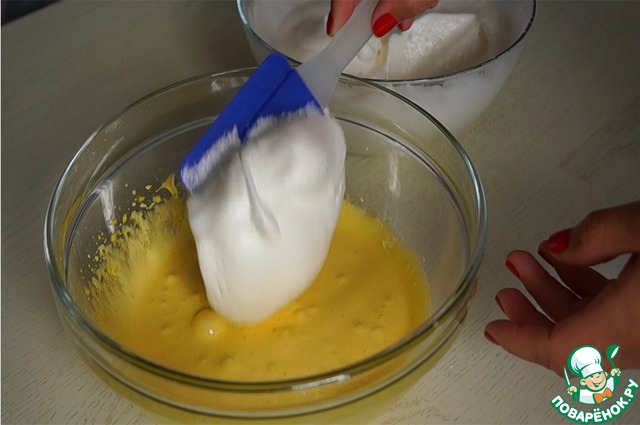 • 1. Белки отделить от желтков. Белки взбить в пену, постепенно добавить половину сахара, взбить до устойчивых пиков. Желтки взбить с оставшейся половиной сахара до посветления массы. Белки постепенно добавить к желткам и аккуратно перемешиваем круговыми движениями