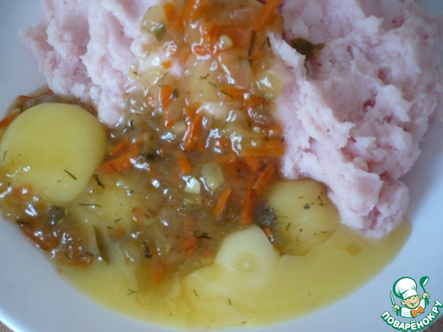 Теперь соединяем с куриным фаршем желтки, заправку для рассольника,MAGGI и черный молотый перец. Все хорошо перемешать.