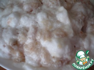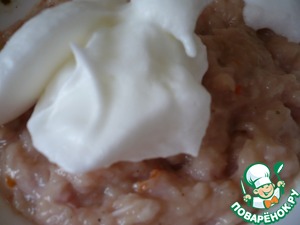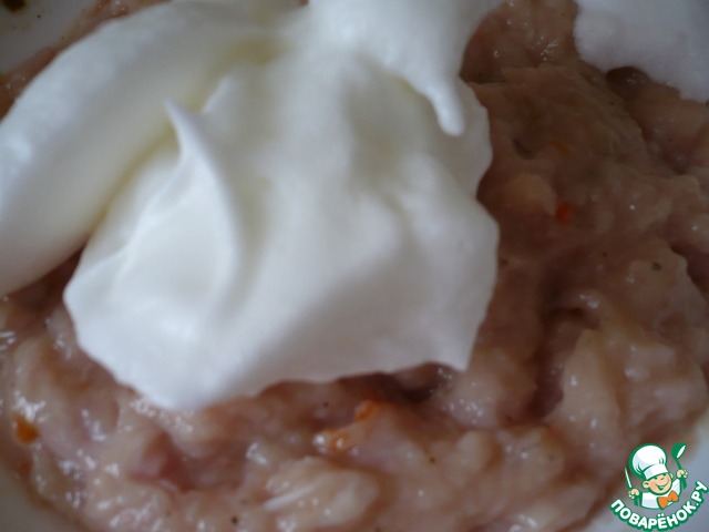 Осторожно, перемешать белки с фаршем. Важно чтобы фарш оставался воздушным, по консистенции он напоминает очень воздушную сметану.
