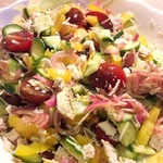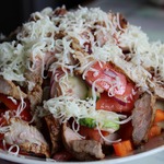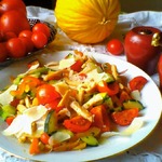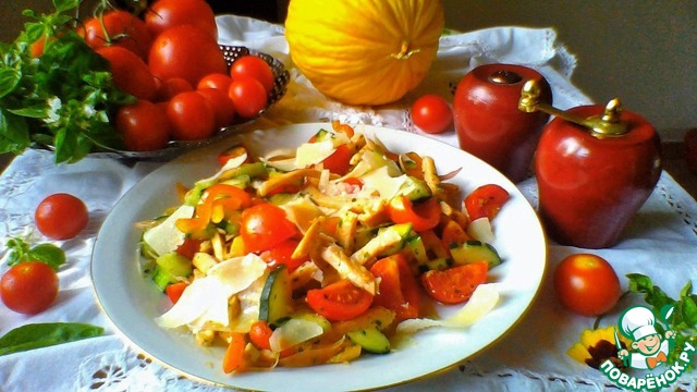 Летние вкусные овощи, мясо и сыр. Летний, сытный, но не тяжелый салат. Прекрасный завтрак перед долгой прогулкой или отличный ужин. Готовлю такой салат не реже трех раз в неделю. Угощайтесь!