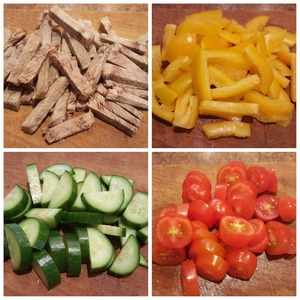Нарезать мясо и перец соломкой, огурцы и помидоры по желанию, но не слишком мелко.