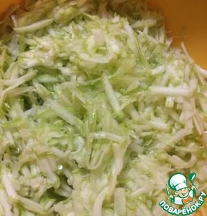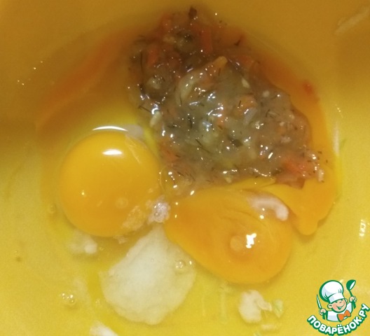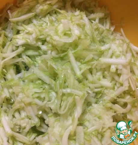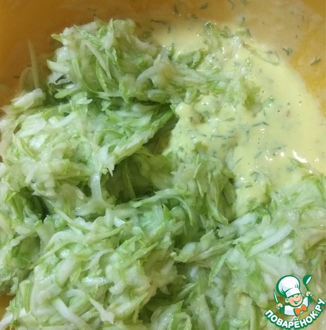 Натертый кабачок хорошо отжать руками и добавить к смеси. Хорошо перемешать.