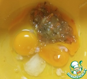 В глубокую миску разбить 2 яйца, добавить соль и заправку Магги для рассольника. Взбить смесь вилкой в течение 1 минуты.