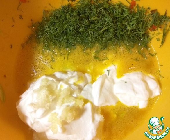Во взбитую смесь добавить творог, мелко нарезанную зелень укропа и пропущенный через пресс чеснок.